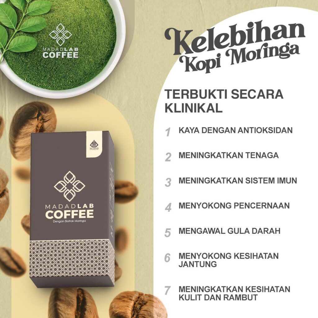 Kopi Moringa MadadLab menggabungkan kebaikan kopi yang memberikan rasa lazat dan juga manfaat kesihatan dari ekstrak daun Moringa yang kaya dengan nutrien.